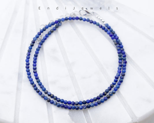 Lapis Lazuli 2mm Round Beaded Choker, Natural Gemstones, Tiny Beaded Necklace