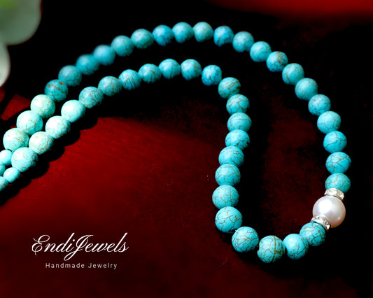 Green Turquoise 10mm Round Beads with White Pearl Necklace